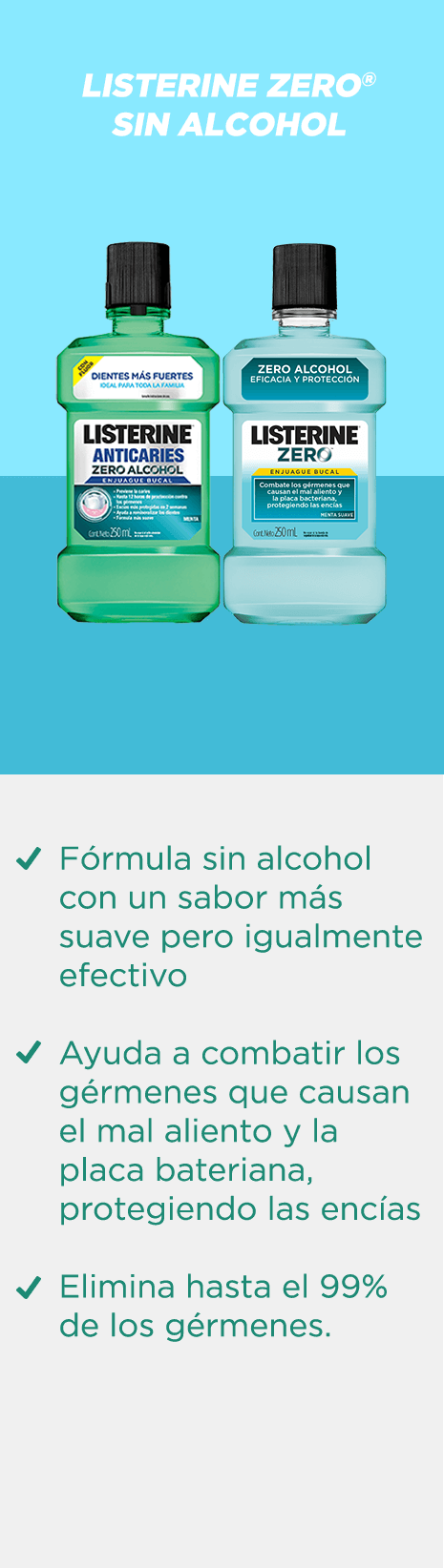 Todas las variedades de enjuagues bucales LISTERINE® eliminan los gérmenes que causan el mal aliento y refrescan tu boca, dejándola completamente limpia.